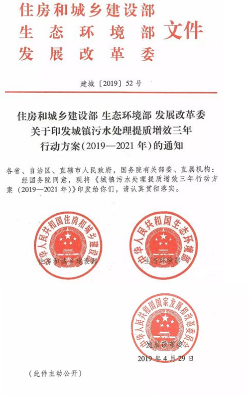 為貫徹落實(shí)全國(guó)生態(tài)環(huán)境保護(hù)大會(huì)、中央經(jīng)濟(jì)工作會(huì)議精神和《政府工作報(bào)告》部署要求,加快補(bǔ)齊城鎮(zhèn)污水收集和處理設(shè)施短板,盡快實(shí)現(xiàn)污水管網(wǎng)全覆蓋、全收集、全處理,經(jīng)國(guó)務(wù)院同意,住房和城鄉(xiāng)建設(shè)部、生態(tài)環(huán)境部、發(fā)展改革委印發(fā)《城鎮(zhèn)污水處理提質(zhì)增效三年行動(dòng)方案(2019-2021年)》(建城〔2019〕52號(hào),2019年4月29日)。