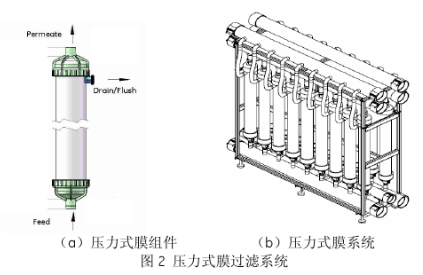 壓力式超濾膜系統(tǒng)水通量高,膜的通量為40~120 lmh,需要的膜面積較少。